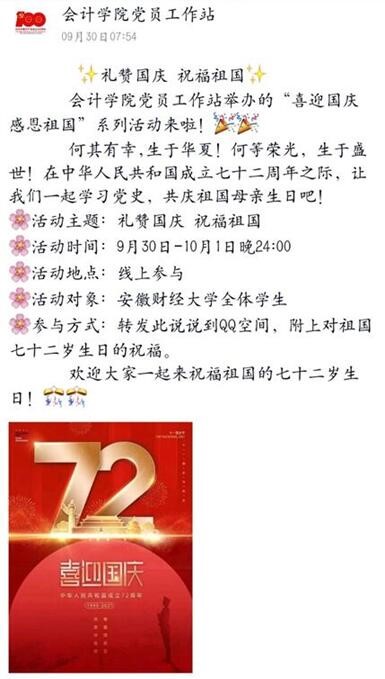 “礼赞国庆 祝福祖国”活动,利用QQ空间转发节日祝福表达青年学生对伟大祖国的热爱之情;“欢度国庆学党史,唱响歌韵送祖国”活动,百名学生共唱红歌,在音乐中重温百年壮阔党史,从经典中汲取奋进力量,在歌声中感恩祖国;“与国庆华诞,携手奏华章”活动,通过一篇篇征文展现了青年与祖国共奋进、与时代共成长的生动画面。